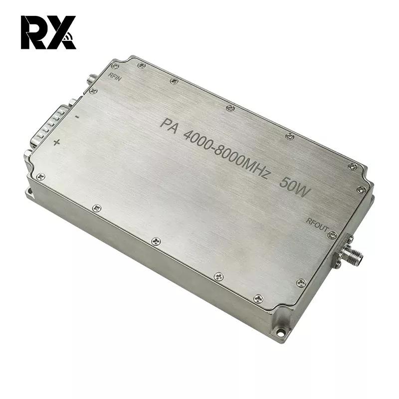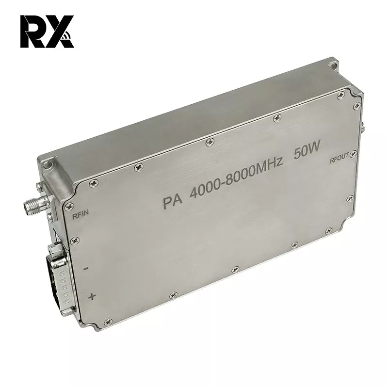 An modúl seo a chlúdaíonn banna minicíochta leathan de 4000-8000MHz, tá sé ag luí le bannaí cumarsáide drone a úsáidtear go coitianta mar UHF, L, agus S, deireadh a chur leis an ngá atá le hoiriúnú breise ar fheistí éagsúla; 47dB Módúl Aimplitheoir Drone Ardghnóthachan 50W Tacaíonn 4000-8000MHz le voltas tástála caighdeánach 28V agus sruth oibriúcháin cobhsaí de 3.6A. Tá sé oiriúnach le haghaidh oibríochtaí ard-déine cosúil le suirbhéireacht agus mapáil, cigireacht, cosaint plandaí, agus cumarsáid éigeandála, rud a fhágann go bhfuil sé ina phríomhchuid d'uasghrádú naisc chumarsáide drone.
